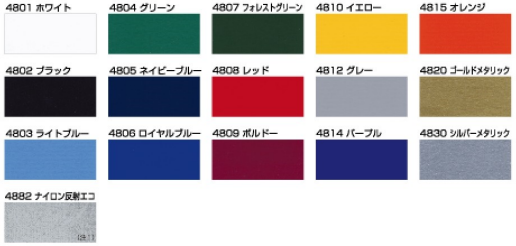 | ※実際の色は異なる場合がございます。 ※生産ロットにより、多少色が異なる場合もございます。 (注1)重ね貼りは、403ライトブルー、420・430メタリック系、440−443ネオン系を除く通常色の上にのみ可能。 可能な色でも諸条件により、仕上がりが異なります。必ずプレス後、洗濯テストをしてから本作業に入って下さい。 |